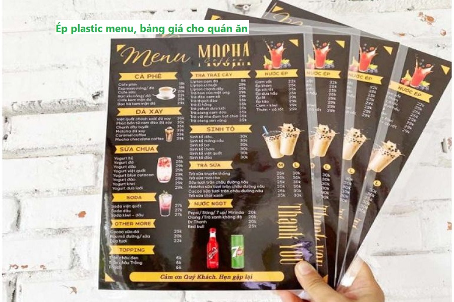 Dịch vụ ép plastic menu là một giải pháp hiện đại và thông minh cho các quán ăn, nhà hàng trong việc quản lý thực đơn. Thực đơn được ép plastic không chỉ đảm bảo độ bền và tính thẩm mỹ mà còn giúp tăng cường trải nghiệm của thực khách. Việc sử dụng menu ép plastic giúp bảo vệ tài liệu khỏi nước, bụi bẩn và các yếu tố gây hại khác, đồng thời tạo cảm giác sạch sẽ, chuyên nghiệp cho không gian ăn uống.